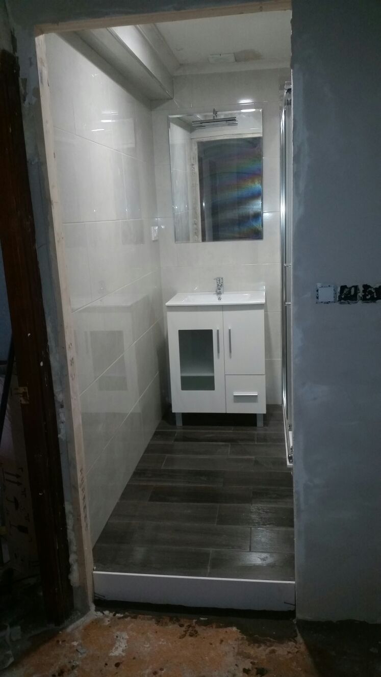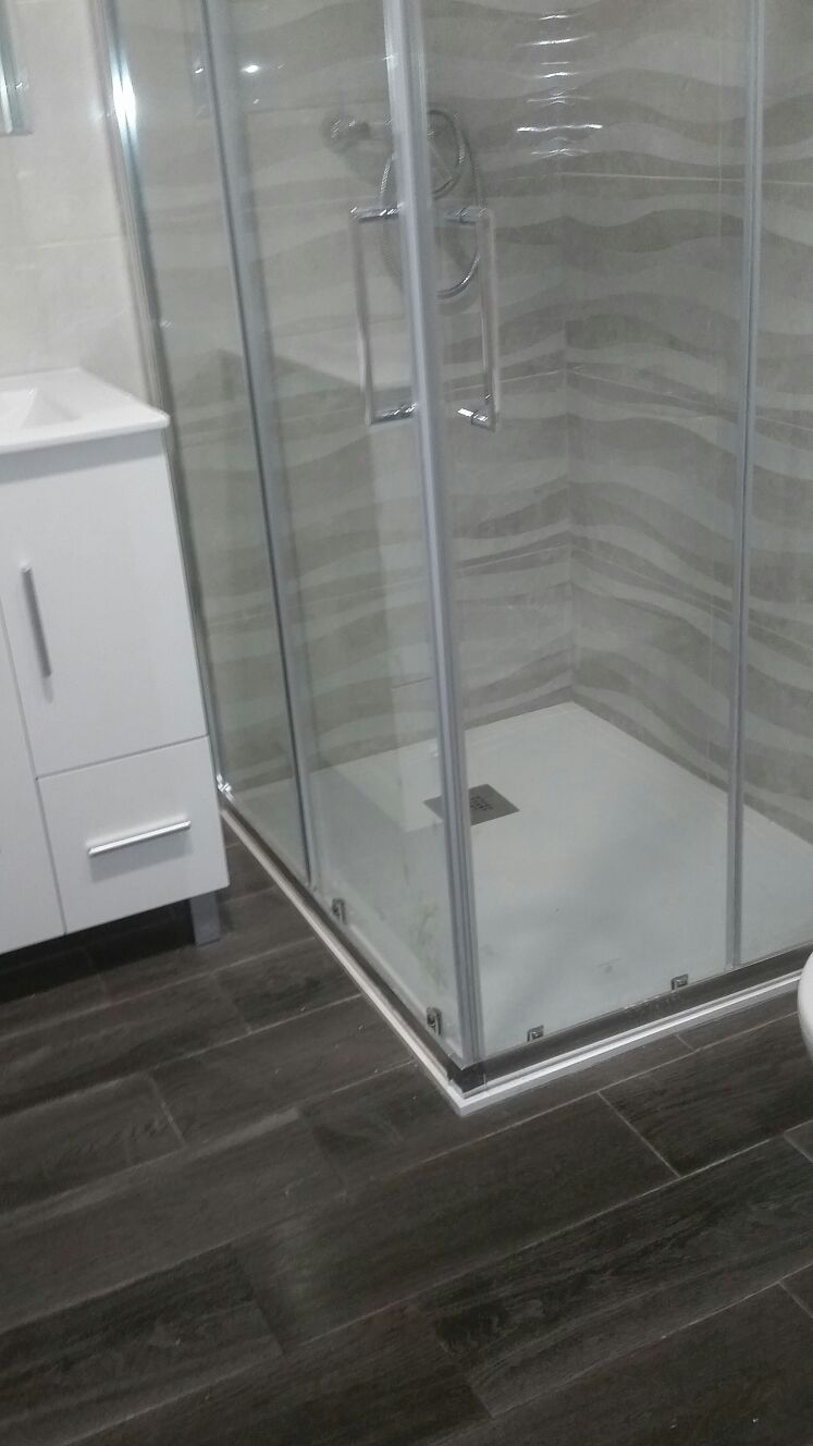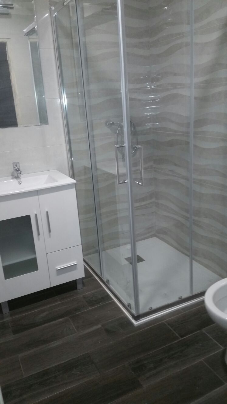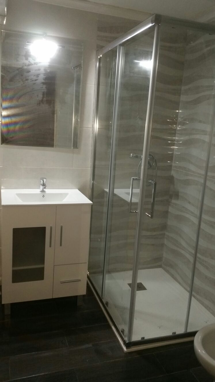 Demolicion de baño completo sustiticcion de tuberias de fontaneria y electricidad, colocaccion de premarco en puerta de entrada desplazando la misma, colocaccion de plato de ducha de resina, alicatado y solado de baño, remate de paredes con moldura de escayola, colocaccion de mampara de baño en angulo con perfiles de acero y cristal templado, colocacion de sanitario y mueble de baño, las griferias colocadas de roca