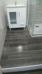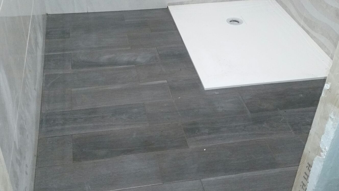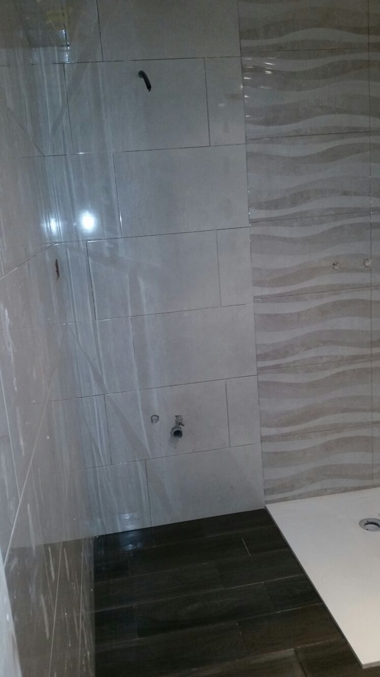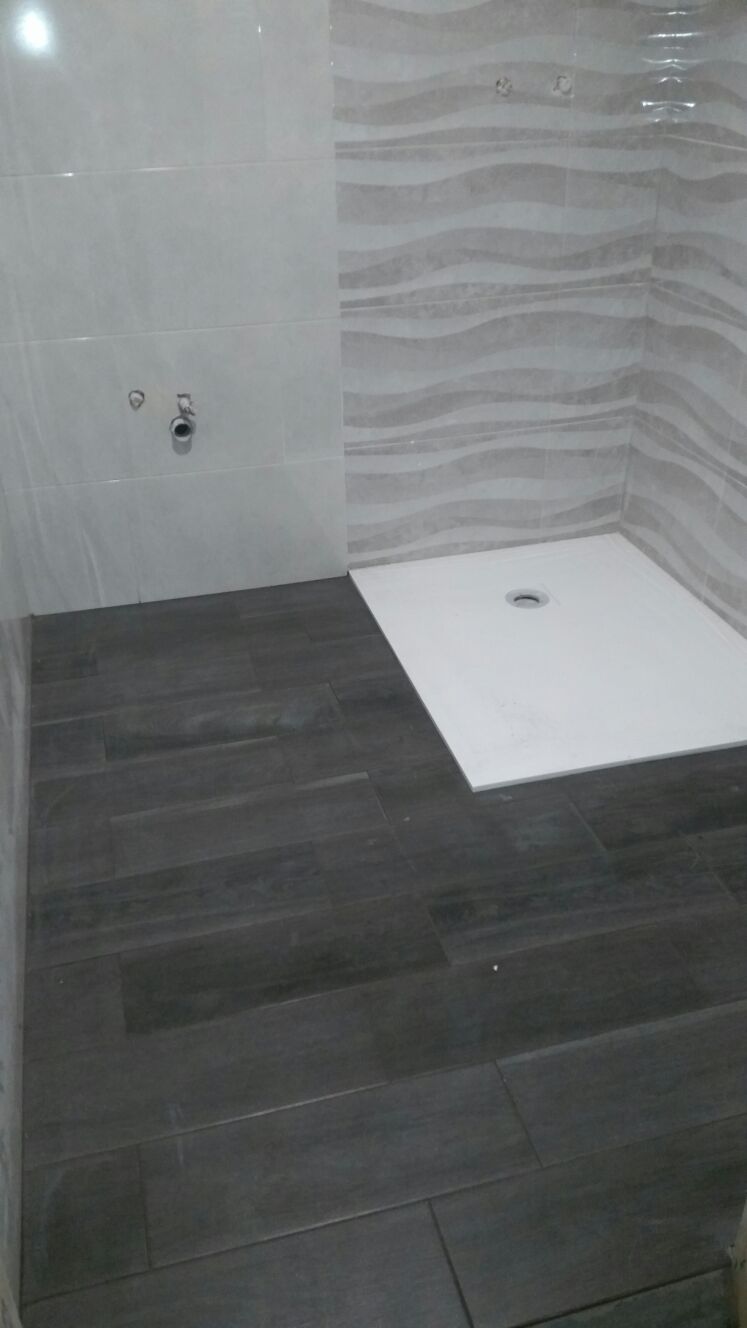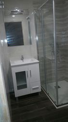 Demolicion de baño completo sustiticcion de tuberias de fontaneria y electricidad, colocaccion de premarco en puerta de entrada desplazando la misma, colocaccion de plato de ducha de resina, alicatado y solado de baño, remate de paredes con moldura de escayola, colocaccion de mampara de baño en angulo con perfiles de acero y cristal templado, colocacion de sanitario y mueble de baño, las griferias colocadas de roca