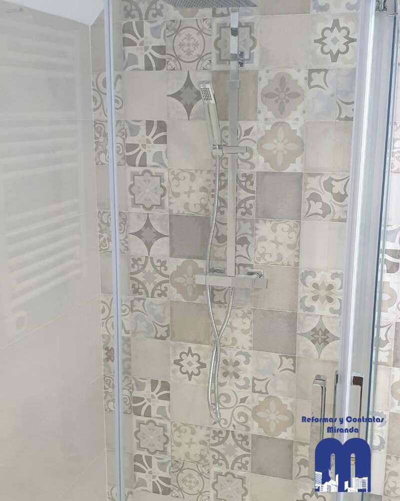 Uno de los elementos más destacados del proyecto es el uso de azulejos hidráulicos decorativos en la zona de la ducha y el frente del inodoro. Su mezcla de tonos neutros y patrones geométricos crea un ambiente cálido, actual y lleno de estilo sin recargar el espacio.