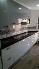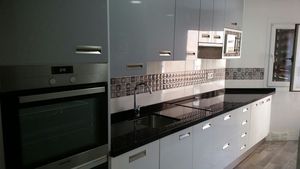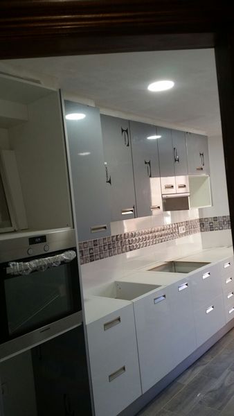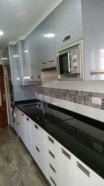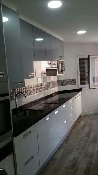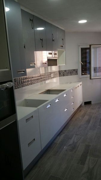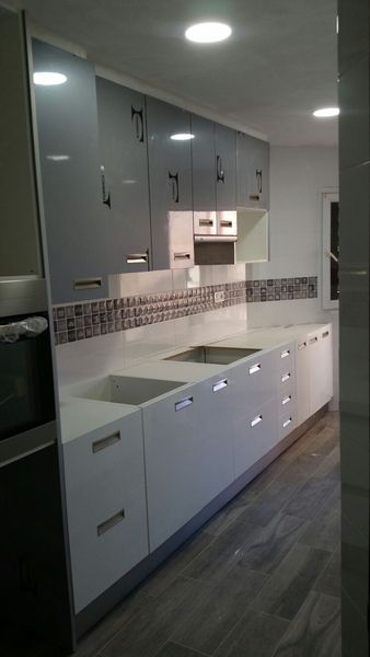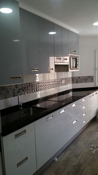 • Muebles de formica moderno en dos tonos gris y blanco brillo con tiradores empotrados