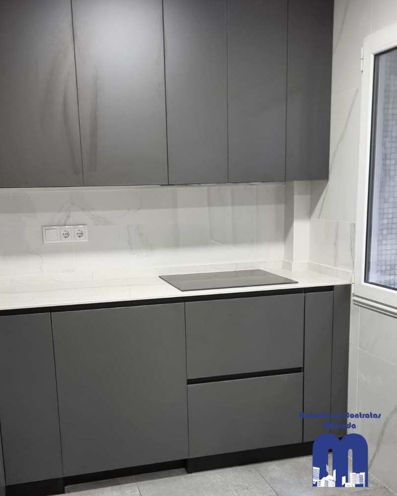 La nueva cocina apuesta por un diseño actual de líneas rectas y limpias, con mobiliario en tono gris antracita mate que aporta sofisticación y carácter al conjunto. La ausencia de tiradores visibles refuerza esa imagen minimalista y ordenada, logrando un espacio visualmente despejado y muy fácil de mantener.