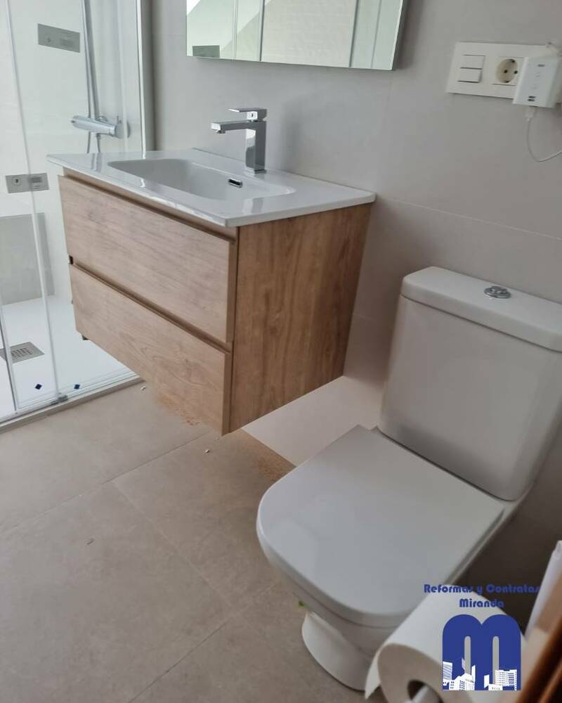 El mueble de lavabo en madera natural contrasta con suavidad, aportando calidez al diseño. El espejo enmarcado y el conjunto de grifería en acabado cromado refuerzan el estilo contemporáneo y elegante.